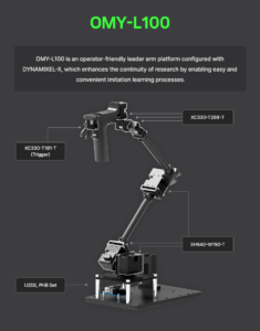 El OMY-L100 actúa como el dispositivo líder en el sistema de teleoperación OMY, diseñado específicamente para el aprendizaje por imitación y el control robótico avanzado con humano en el bucle (human-in-the-loop). Su diseño ligero y ergonómico proporciona una entrada intuitiva de 6 grados de libertad (6-DOF), lo que permite a los operadores replicar de forma natural los movimientos de brazos y manos para guiar al robot en tiempo real.