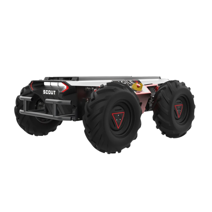El SCOUT 2.0 emplea servomotores sin escobillas (brushless) de 200W para impulsar cada rueda de forma independiente. Su suspensión de doble horquilla (double-wishbone) con amortiguadores asegura la estabilidad en terrenos irregulares, permitiéndole superar obstáculos de hasta 10 cm de altura sin esfuerzo.